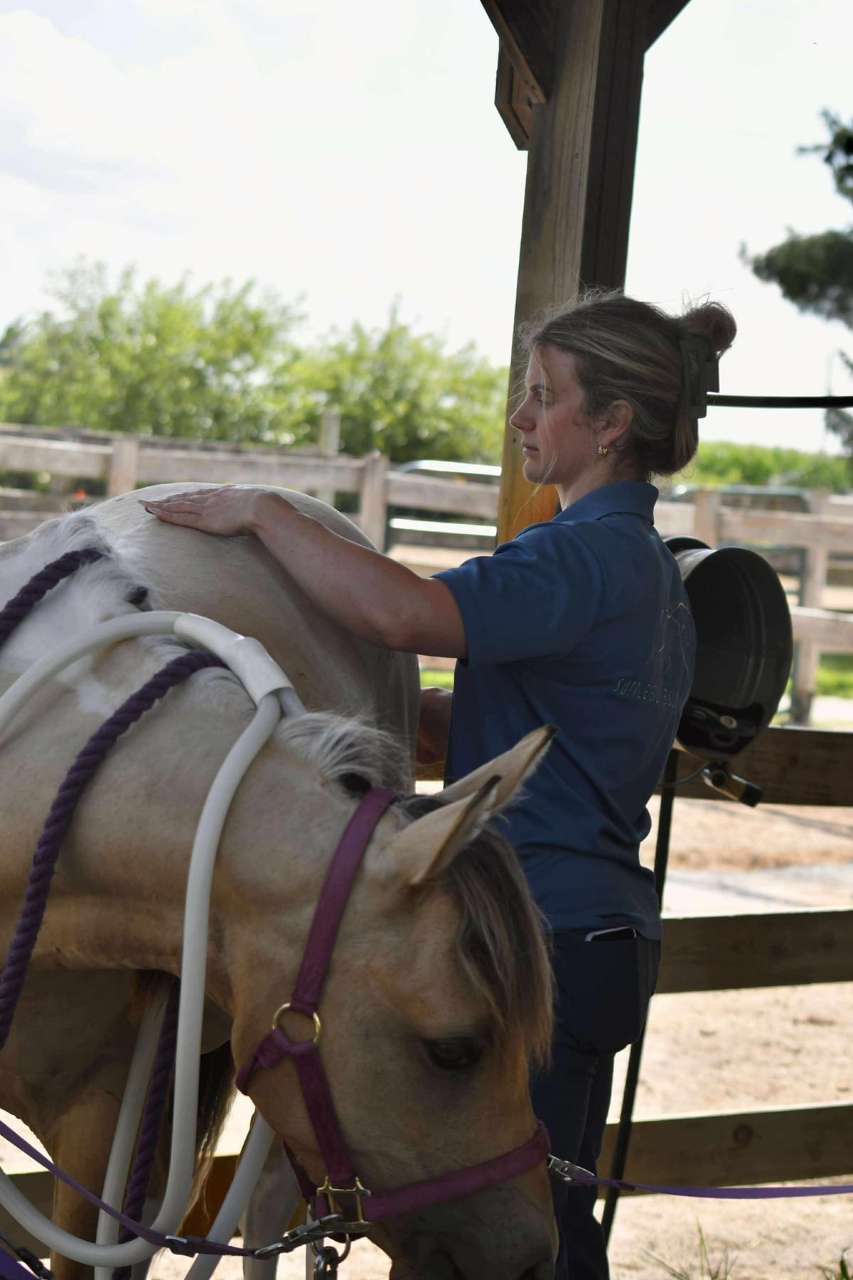 "I am so thankful to have found Chloe! Not only is she extremely knowledgeable, she is also very in tune with the horse and does everything at their pace. I can always trust that she won’t push my sensitive mare’s boundaries and isn’t afraid to let me know if the horse is nearing their tolerance threshold.